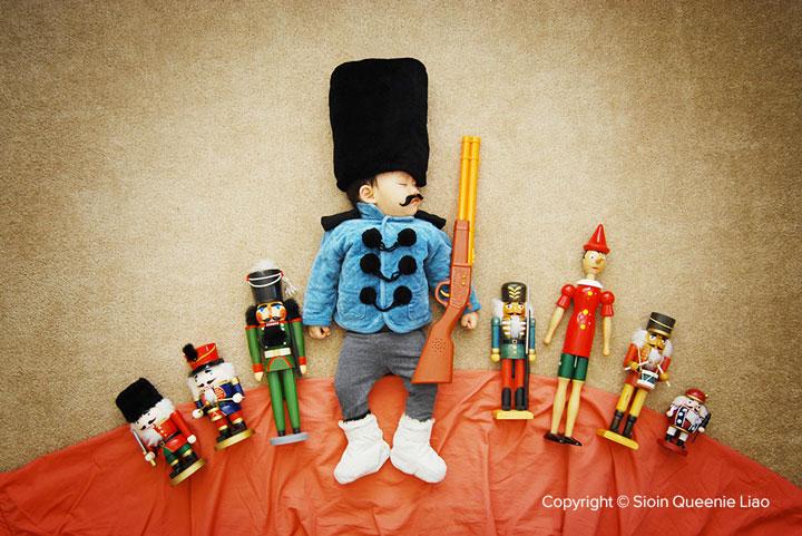 Pour rendre possible ces photos, Queenie explique : "je ‘peins’ derrière lui l’univers dans lequel il évoluera avec des vêtements, des peluches et d’autres objets de la maison".
